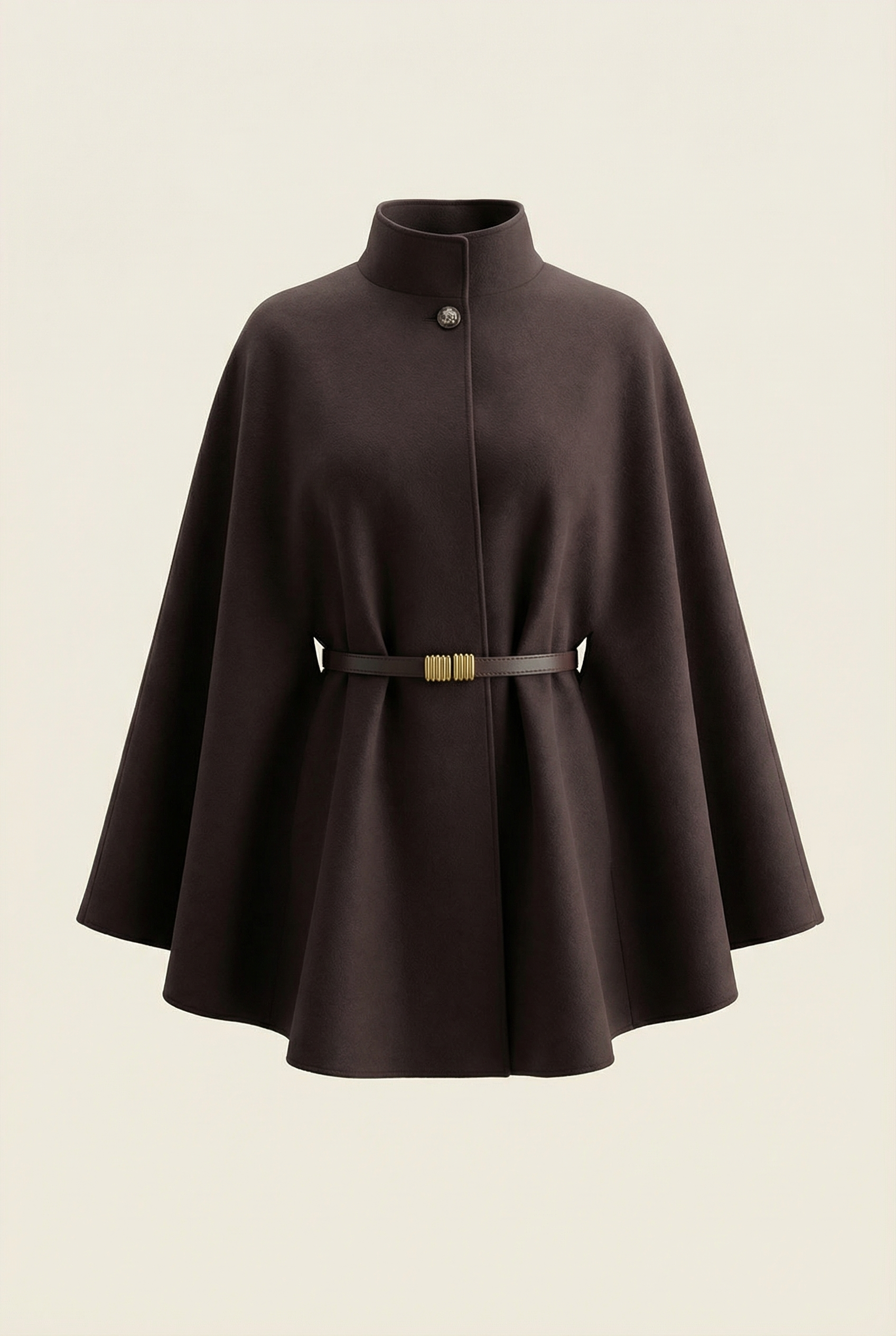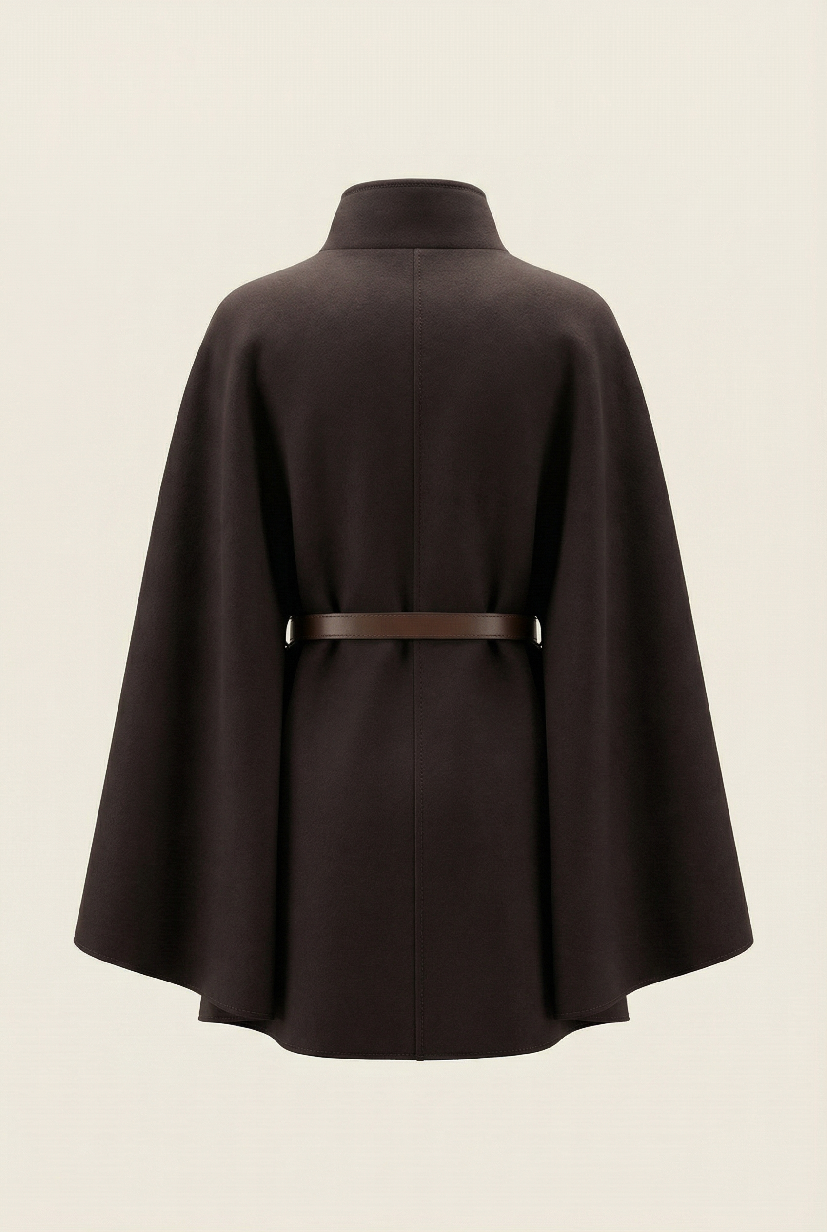 Designed for those who want a piece that “dresses” effortlessly. The cape shape wraps the silhouette, creates movement, and allows true ease at the arms thanks to the batwing sleeves. The stand-up collar keeps the line clean, and the addition of a belt cinches the waist, transforming the look in an instant.